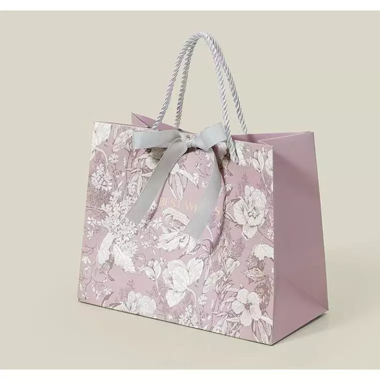 ถุงกระดาษของขวัญลายดอกไม้ สีชมพู พร้อมริบบิ้น BEST WISHES