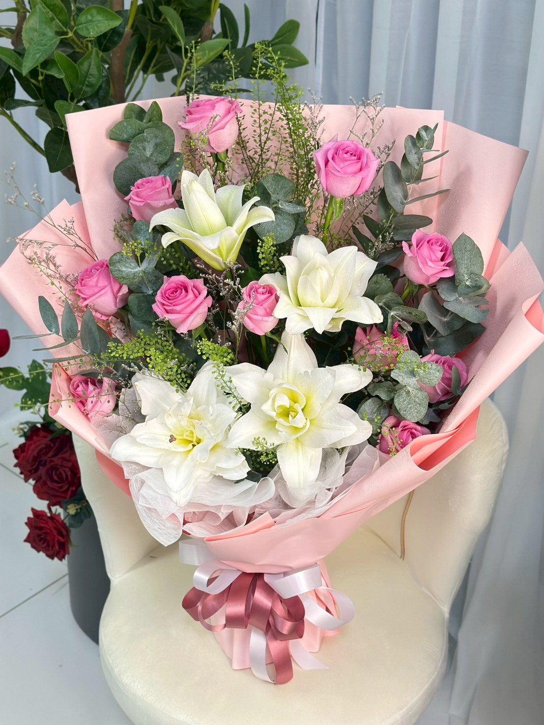 ช่อดอกไม้ลิลลี่ชมพูไฮเดรนเยียฟ้า