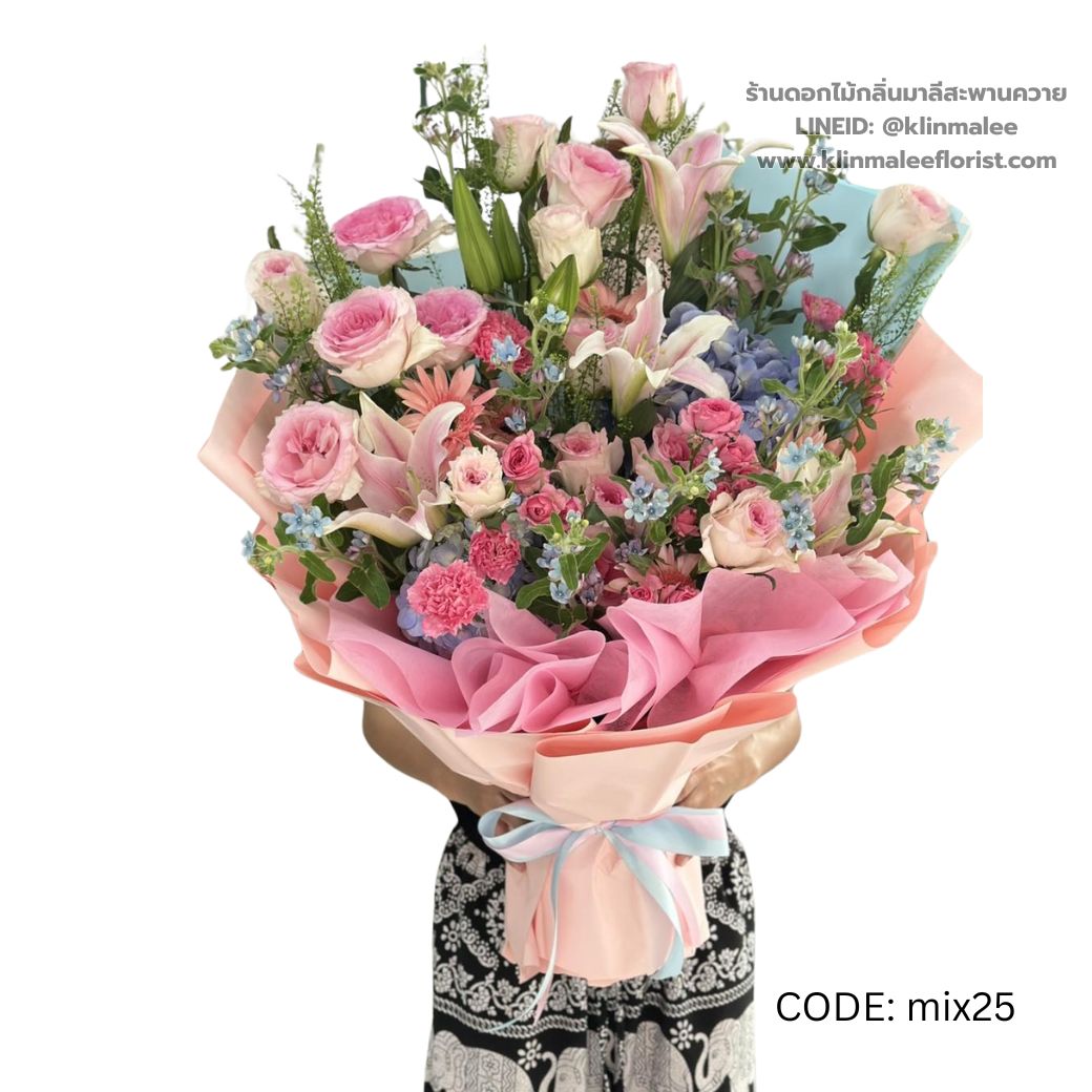 ช่อกุหลาบชมพูรวมดอกโทนหวาน